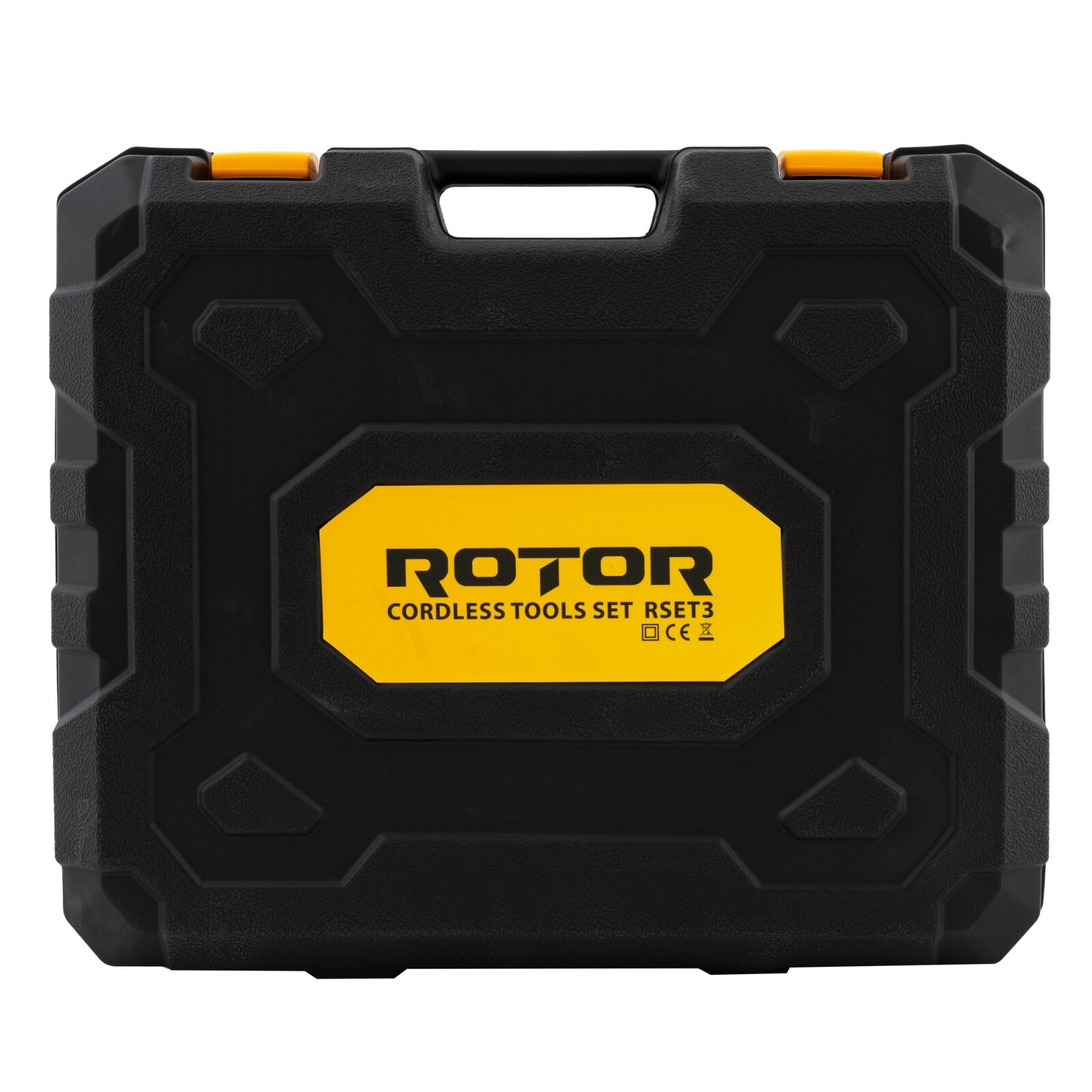 Trusa electrica 3 in 1 ROTOR RSET3 cu acumulator 21 V / 3 Ah, ce include autofiletanta, polizor unghiular si rotopercutor. Ideala pentru lucru versatil, rapid si fara cabluri.