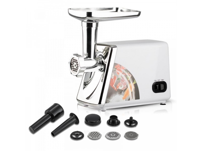 Masina de tocat carne vine cu trei cutite de taiere de dimensiuni diferite, precum si o umplutura de carnati si un set de presare a carnii.