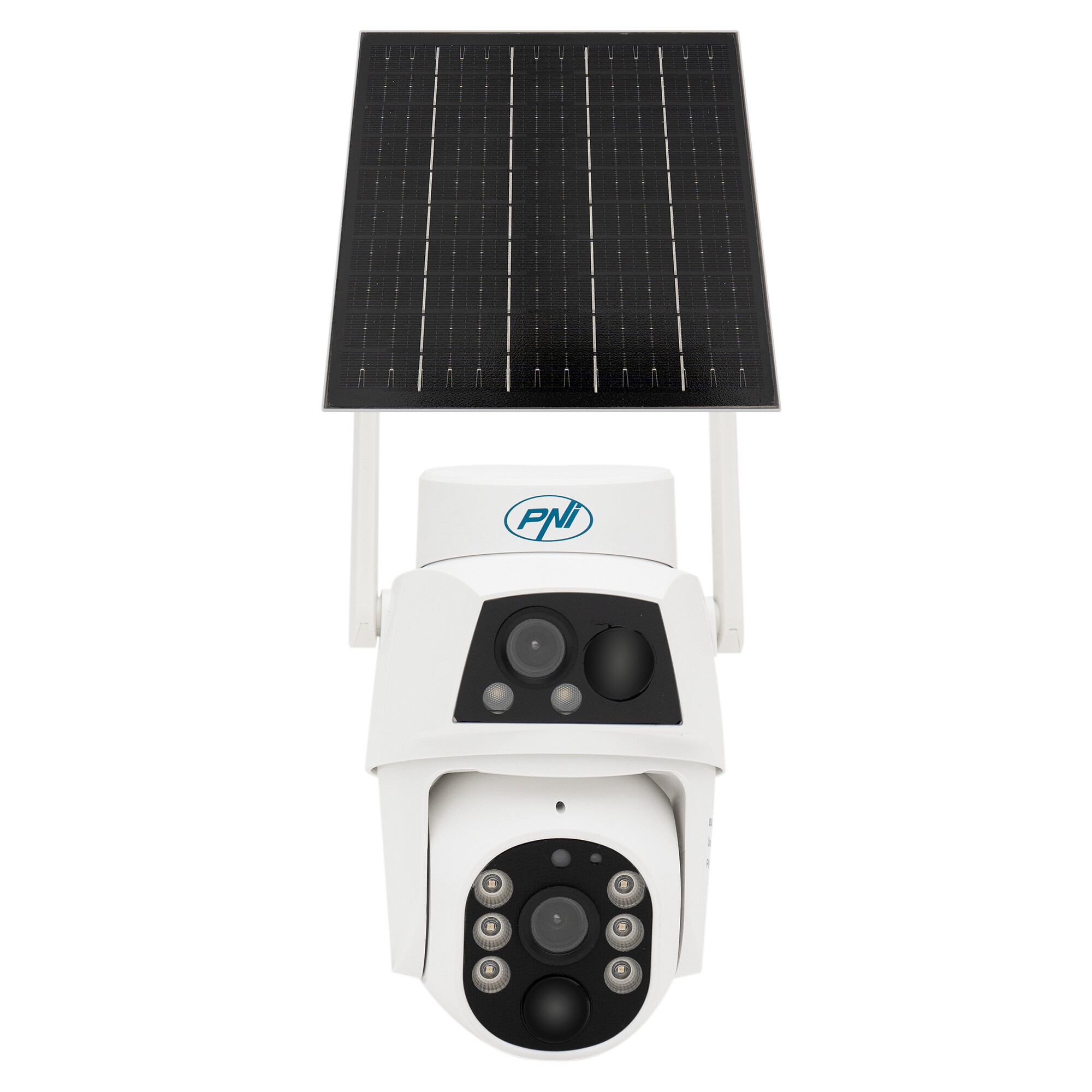 Camera IP PNI IP794 cu Wi-Fi, lentile duale 2MP, alimentare solara si acumulator 8000mAh. Control PTZ si monitorizare wireless 100% autonoma.