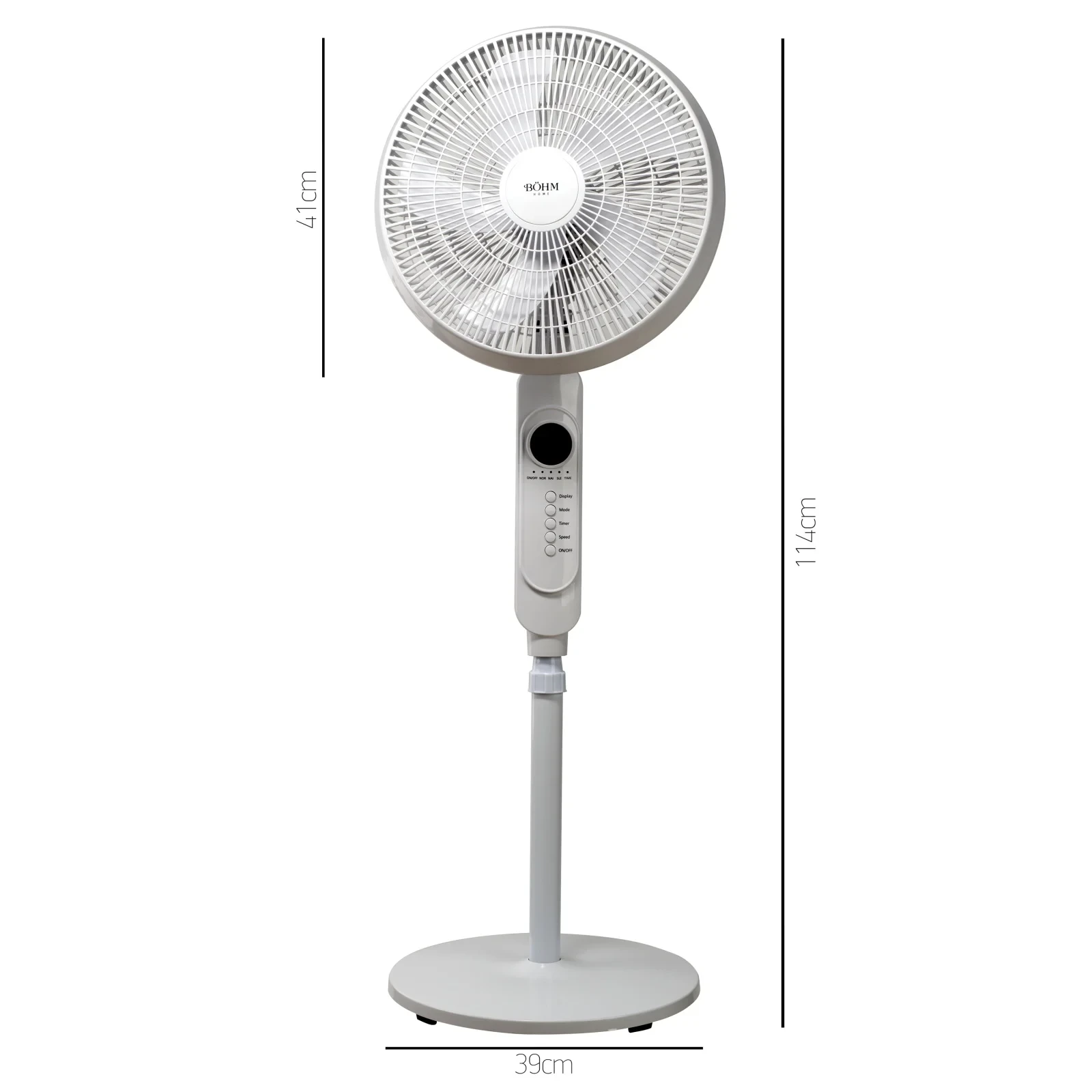 16" BOHM Floor Fan BF403RC-5B with 3 speeds, 45W power, adjustable height up to 125 cm, and 75° oscillation for efficient cooling.
