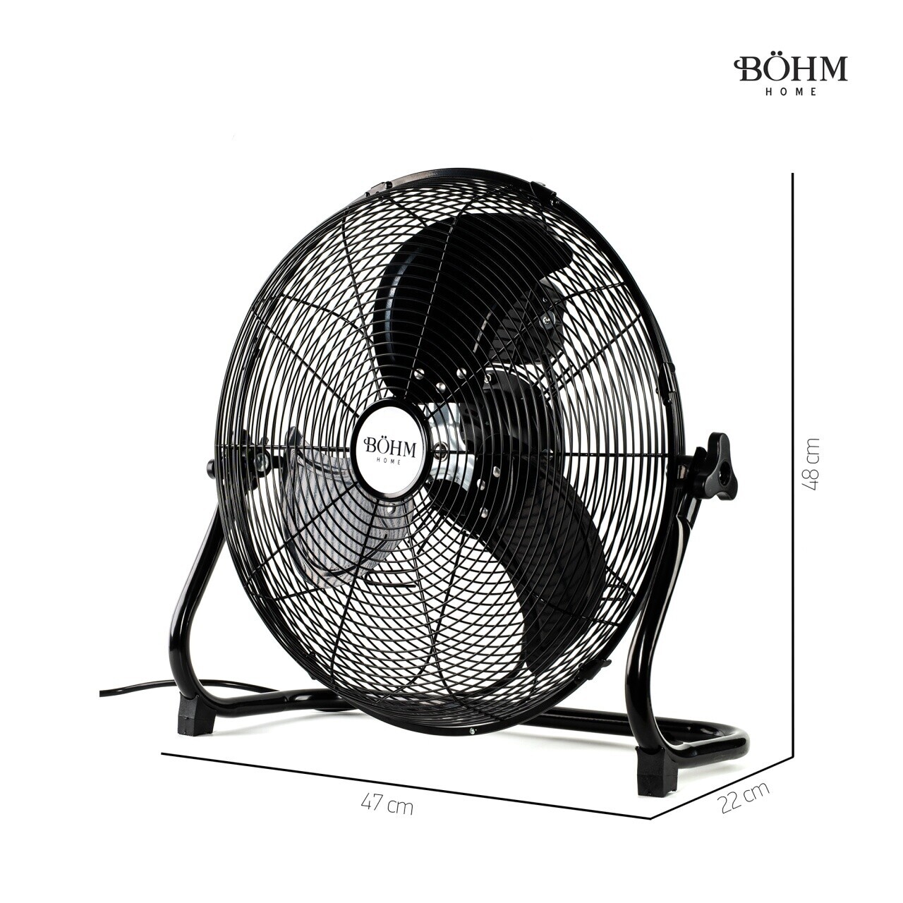 Powerful 16" floor fan BOHM BLFF-40 with 3 speed settings and 90 W motor. Features adjustable tilt angle for precise airflow direction.