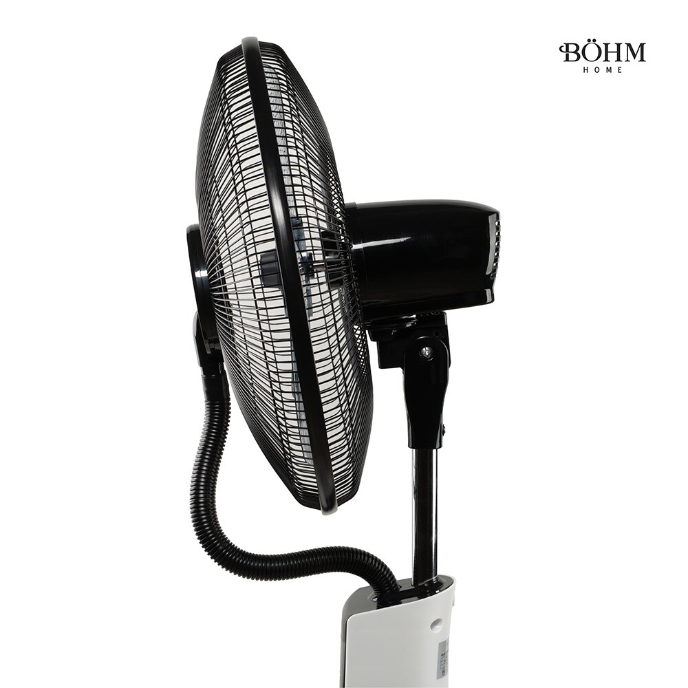 Powerful fan with water mist spray and humidifying function. BÖHM BSP40-RA model, 16", ideal for cooling and comfort on hot days.