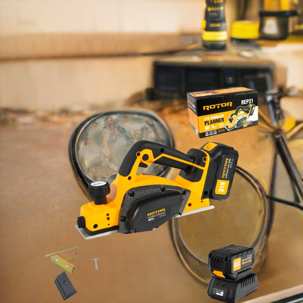 The ROTOR REP21 cordless planer is a versatile and efficient tool, perfect for woodworking, whether you are a professional or an amateur. Equipped with a 21 V battery and 3 Ah capacity, this planer offers excellent mobility, eliminating the need to be connected to a power source during use.