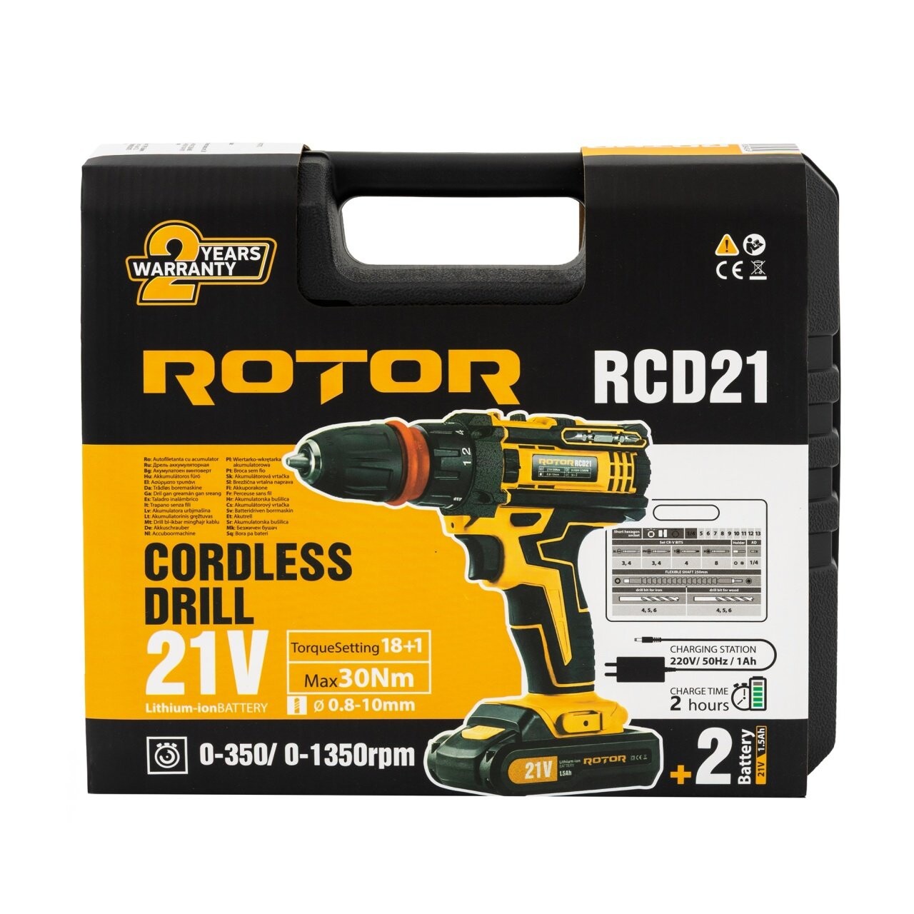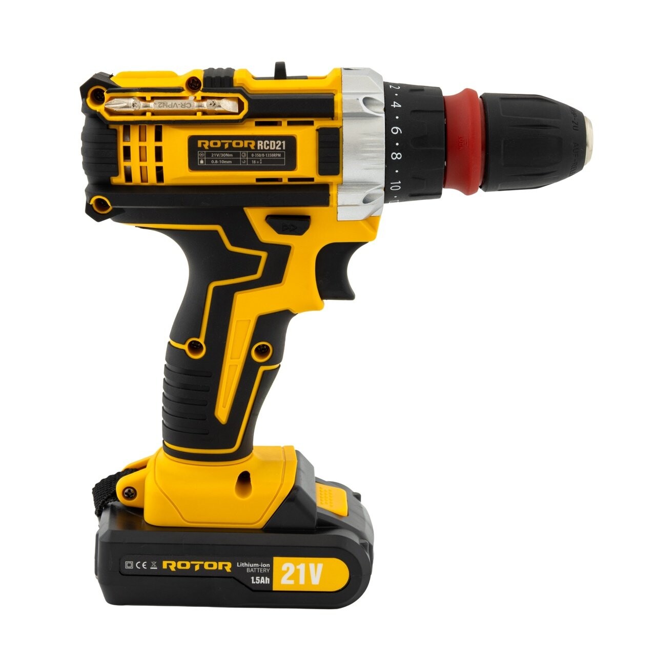 ROTOR RCD21, Brushless 21V self-tapping drill with 2 batteries, speed 1350 RPM + bit kit. Power and mobility for any job.